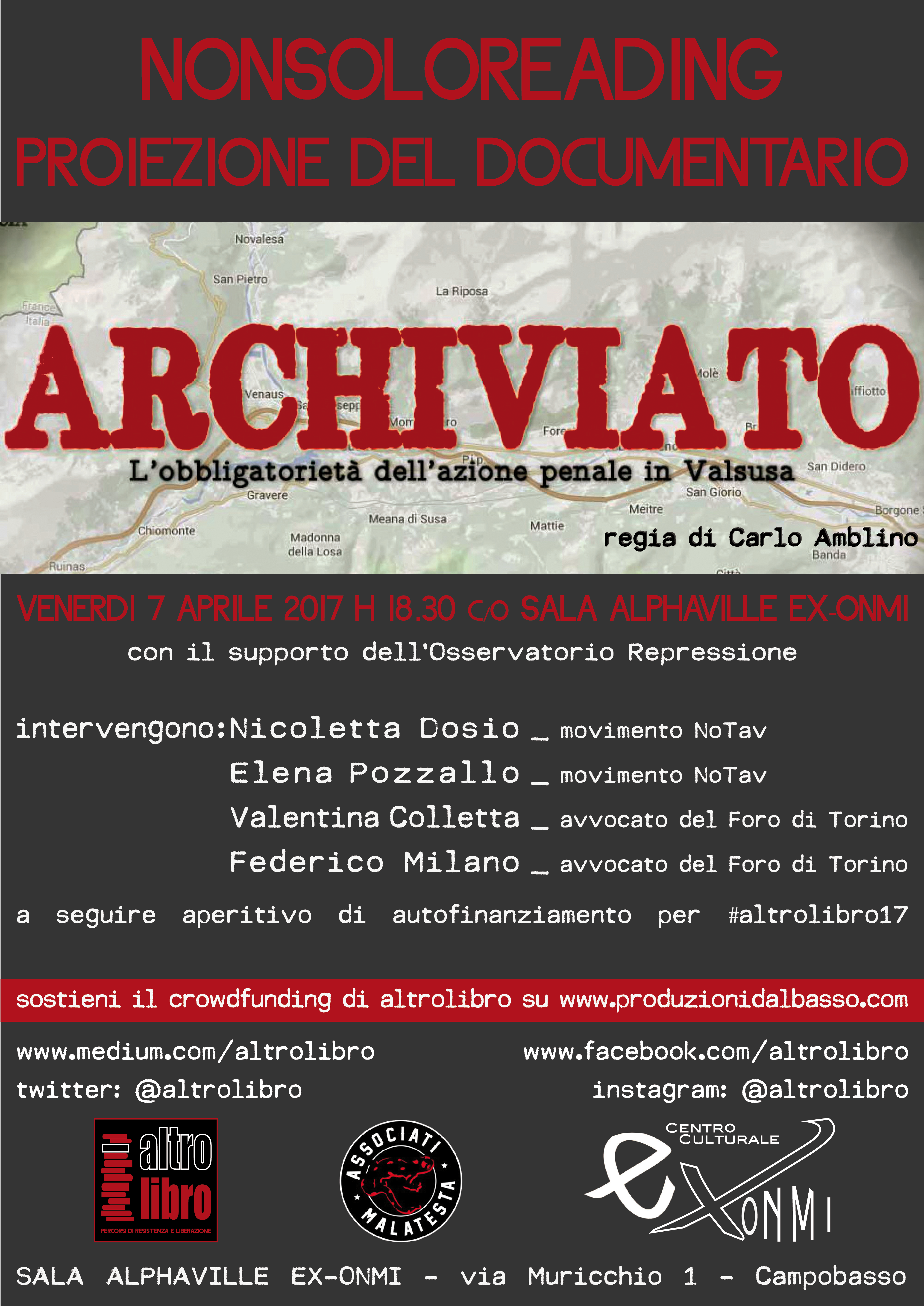 In attesa dell’edizione 2017 della fiera della piccola e media editoria che si terrà nel mese di giugno a Campobasso, il collettivo di Altrolibro torna, venerdì 7 aprile alle ore 18.30, presso la sala Alphaville Ex-Onmi a Campobasso, con un incontro collaterale e d’accompagnamento alle tematiche che la fiera anche quest’anno intenderà sviluppare, proponendo al pubblico la visione del documentario di Carlo Amblino: Archiviato. L’obbligatorietà dell’azione penale in Valsusa.
