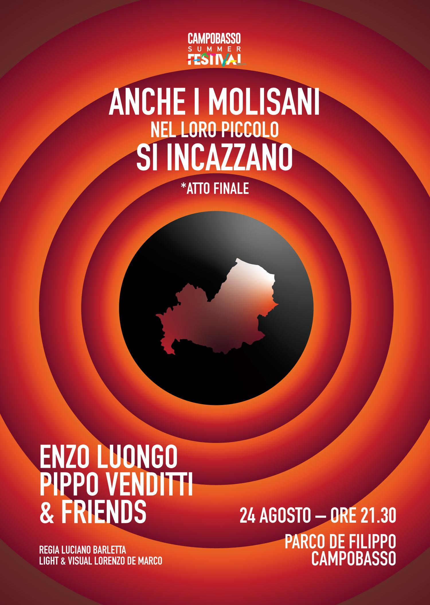 Il Campobasso Summer Festival 2022 prevede, oltre ai tre concerti sopracitati anche, il 24 agosto, alle ore 21.30, sempre al Parco E. De Filippo, lo spettacolo di Pippo Venditti, Enzo Luongo & Friends dal titolo “Anche i molisani nel loro piccolo si incazzano. Atto finale”.