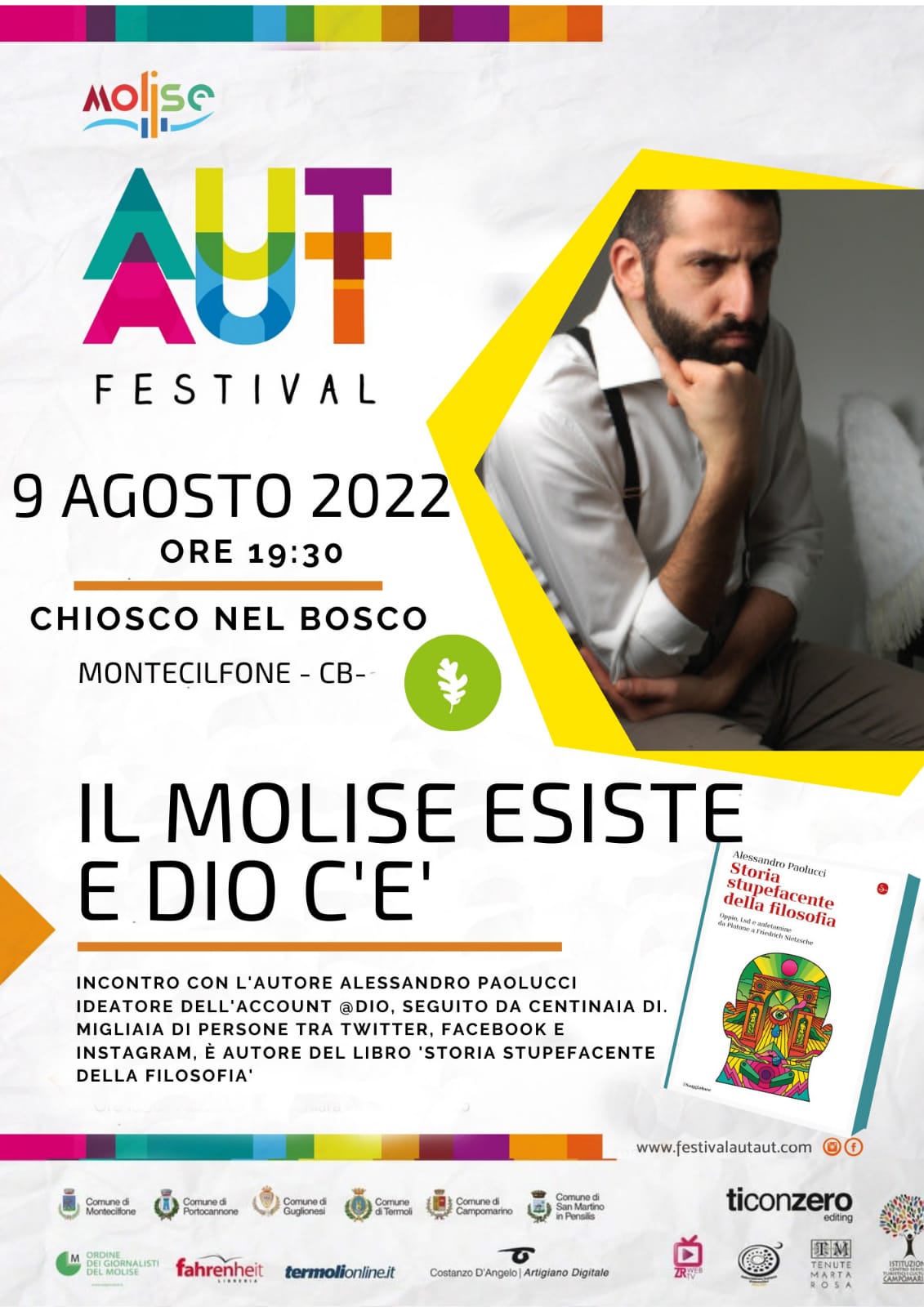 L’autore Alessandro Paolucci conosciuto e seguito da centinaia di migliaia di follower sui social con alias @DIO nella bellissima natura del Bosco di Corundoli a Montecilfone ci parlerà del suo libro “Storia stupefacente della filosofia” nato da un pensiero fisso: “Ma i filosofi cosa si fumavano?”.
