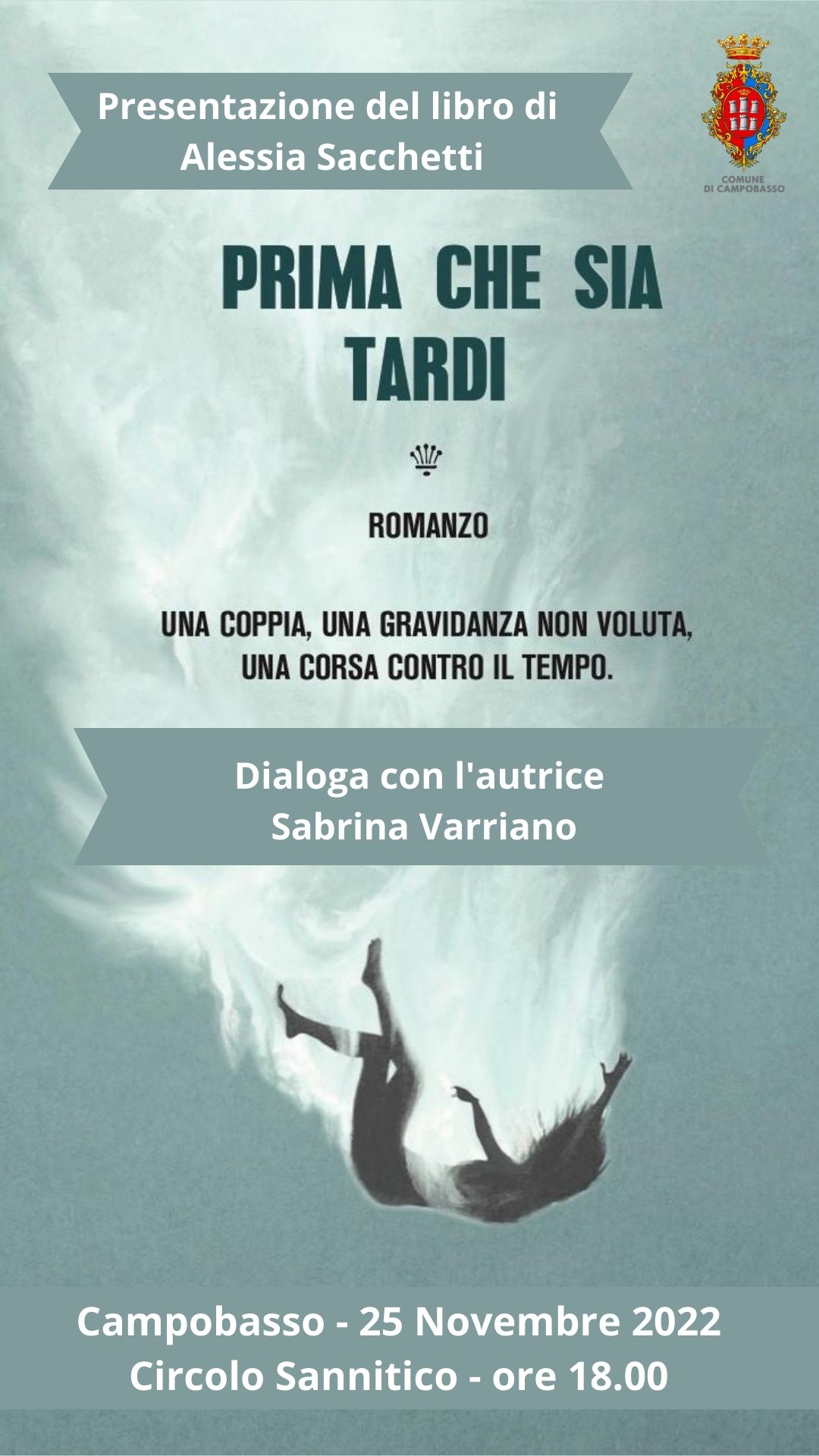 “Prima che sia tardi” è il racconto di una gravidanza inaspettata e della delicata scelta che ne consegue: la decisione di interromperla. A dialogare con l’autrice ci sarà la giornalista Sabrina Varriano. L’evento rientra nel calendario degli appuntamenti di “Novembre in Città”, elaborato dall’assessorato alla Cultura del Comune di Campobasso.