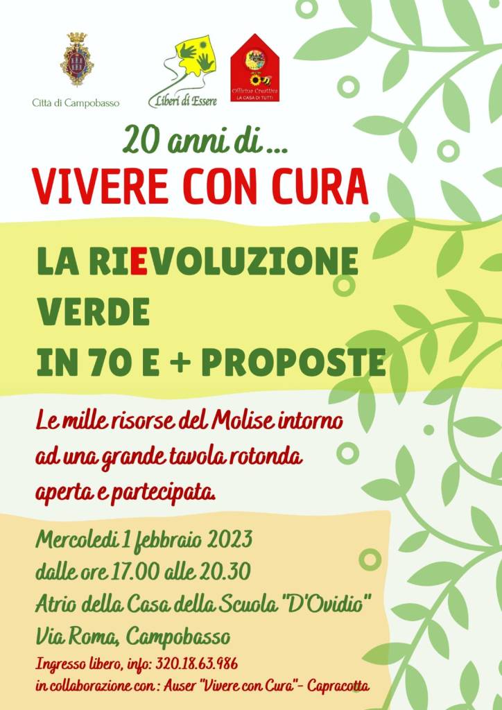 Mercoledì 1 febbraio, invece, nata da una proposta dell’associazione Liberi di Essere, si terrà, presso l’atrio della Casa della Scuola “D’Ovidio” di via Roma, una tavola rotonda aperta e allargata sul tema “La Ri(E)voluzione verde”, a cui prenderanno parte decine di micro-aziende agricole e dell’agro-alimentare oltre che una rete di enti ed associazioni, per un dialogo aperto sul vivere con cura e le diverse sfaccettature della sostenibilità.