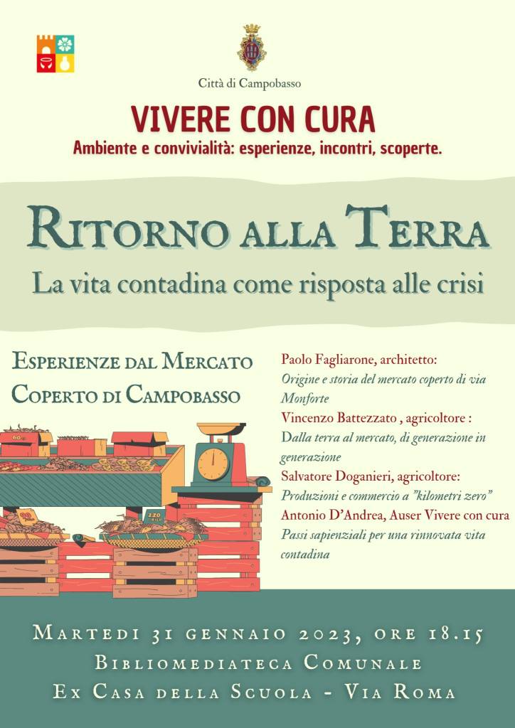 Martedì 31 gennaio, presso la BiblioMediaTeca comunale in via Roma a Campobasso, alle 18.15, si terrà l’incontro “Ritorno alla terra – la vita contadina come risposta alle crisi” che metterà al centro del dibattito le esperienze dei contadini locali e della filiera corta, con una particolare attenzione all’esempio del Mercato Coperto di via Monforte e alla sua evoluzione/involuzione subita negli anni, con uno sguardo anche agli scenari futuri che interesseranno la struttura con i prossimi lavori di riqualificazione.