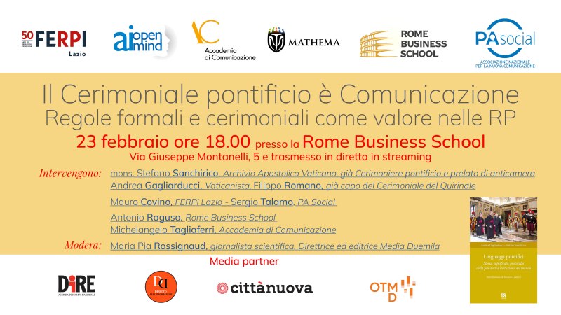 Si terrà il 23 Febbraio 2023 alle ore 18.00 a Roma presso la Rome Business School in Via Giuseppe Montanelli 5 e sarà trasmesso in diretta in streaming previa registrazione “Il Cerimoniale pontificio è Comunicazione. Regole formali e cerimoniali come valore nelle RP”, evento formativo organizzato da Ferpi Lazio – Delegazione regionale della Federazione Relazioni Pubbliche Italiana in collaborazione con Rome Business School, Accademia di Comunicazione, Ai open mind e PA social e con la Media Partnership dell’Agenzia di Stampa Nazionale DIRE, Diritto dell’informazione, Città Nuova, Media Duemila.