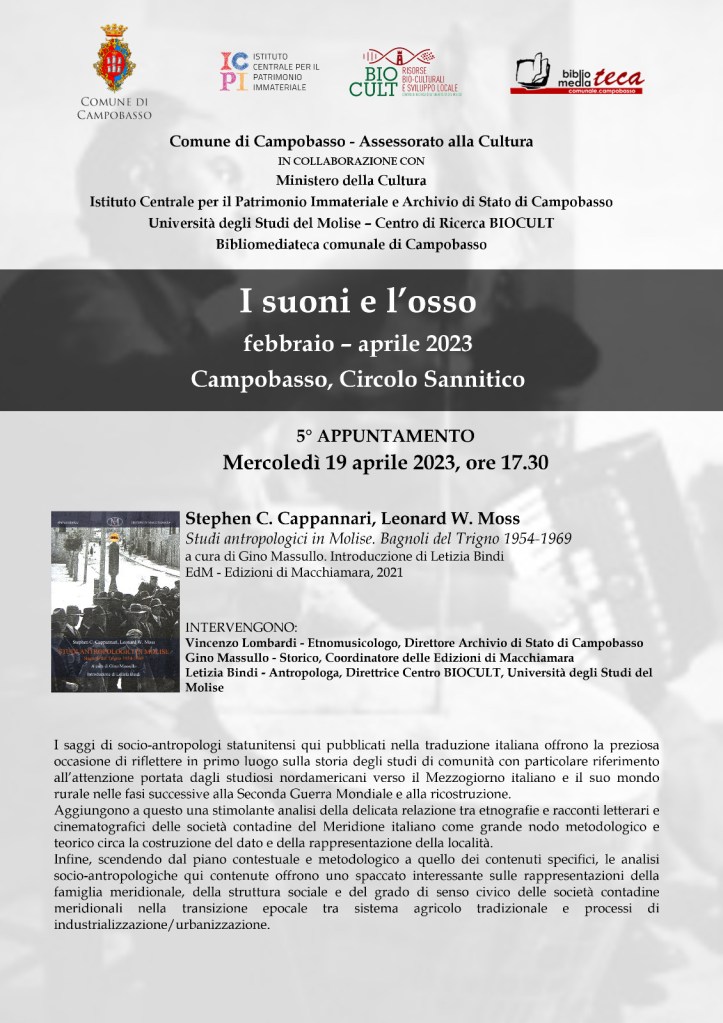 Mercoledì 19 aprile, alle ore 17.30, al Circolo Sannitico, con l’incontro che avrà come tema il testo di Stephen C. Cappannari e Leonard W. Moss “Studi antropologici in Molise. Bagnoli del Trigno 1954-1969, si concluderà il programma, che ha preso il via nel mese di febbraio, della rassegna “I suoni e l’osso”, un ciclo che ha proposto in tutto ben cinque incontri dal forte interesse etnoantropologico ed etnomusicale, promosso il Comune di Campobasso, attraverso l’assessorato alla Cultura, in collaborazione con il Ministero della Cultura, Istituto Centrale per il Patrimonio Immateriale e l’Archivio di Stato di Campobasso, l’Università degli Studi del Molise – Centro di Ricerca BIOCULT e la Bibliomediateca Comunale di Campobasso.