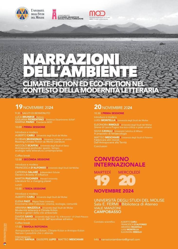 Sono questi e altri gli argomenti proposti dal Convegno internazionale “Narrazioni dell’ambiente. Climate-fiction ed Eco-fiction nel contesto della modernità letteraria”, che si svolgerà nella Sala “E. Fermi” della Biblioteca di Ateneo, in viale Manzoni a Campobasso, nelle giornate del 19 e 20 novembre 2024 e che vedrà la partecipazione di importanti personalità letterarie italiane e straniere.